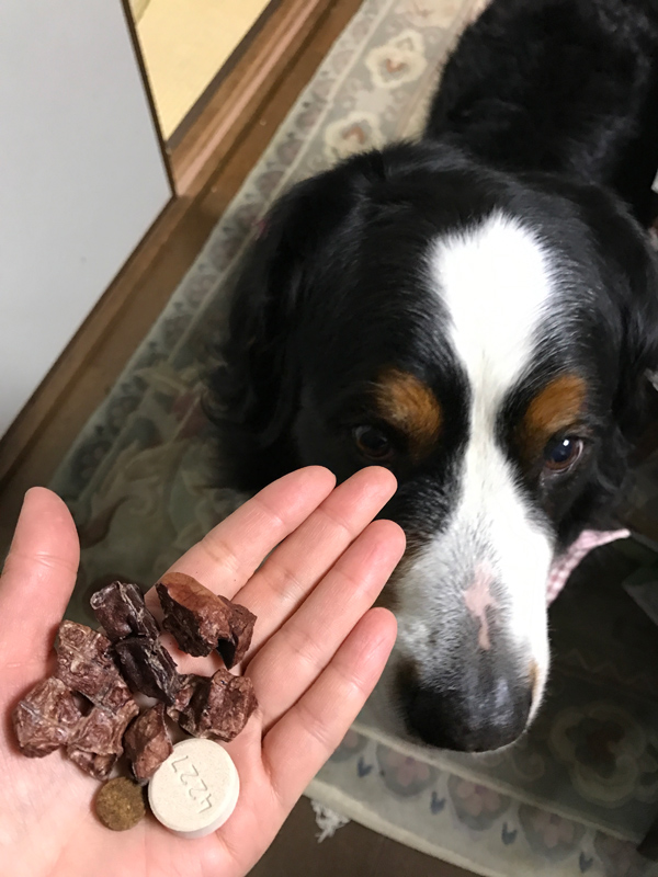 本日は居間で、ノミとフィラリアのお薬+おやつです。