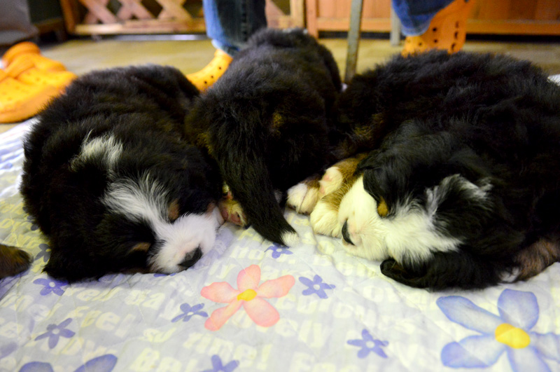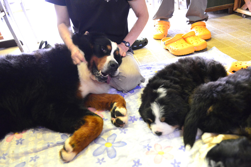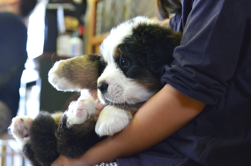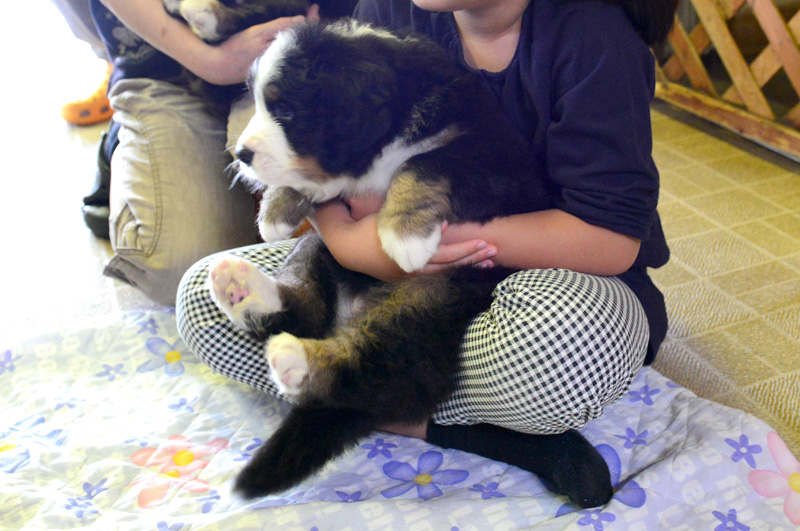 姪っ子は初めて見るバーニーズのパピー達におっかなびっくり。